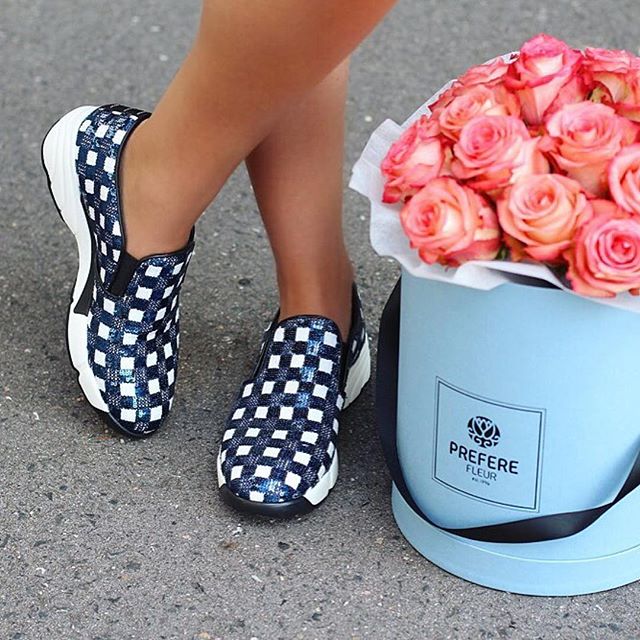 Sneakers have a leather edging, ornaments in the form of rhinestones, laid out in the technique of degradation (a smooth transition of color or shade to another), and sequins imitating a checkered pattern “Vichy”.