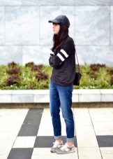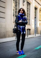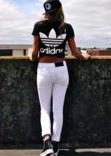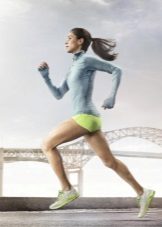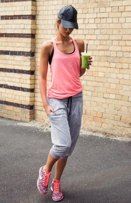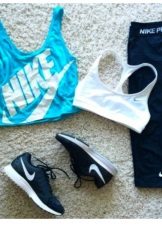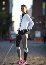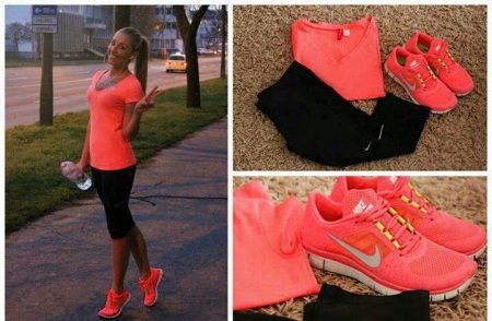 Colorful running sneakers in combination with short sports trousers and a double jersey will appeal to any modern girl.