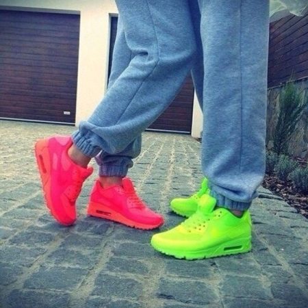 Bright neon sneakers in combination with soft sweatpants will support a stylish and original image not only in the gym, but also on daily walks with friends.