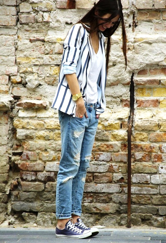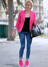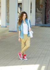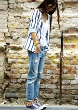 - For a walk - jeans, shorts, tops and T-shirts, with jeans or a jacket from the top with textile sneakers of any cut and color. Fashionable option - marine style.