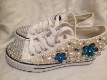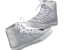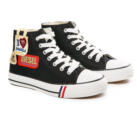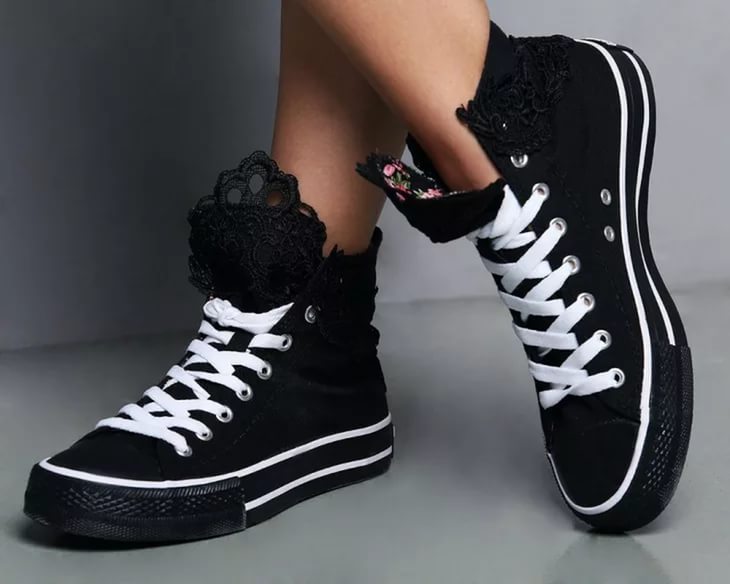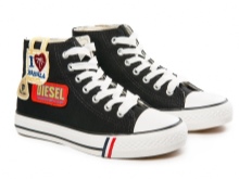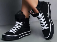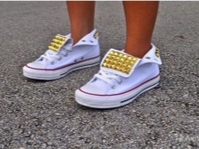 These shoes are decorated in various ways - stripes of stripes or names of musical groups, slogans, rivets, spikes, lacing, velcro, large seam, rhinestones, sequins, lace. For children - cartoon characters.