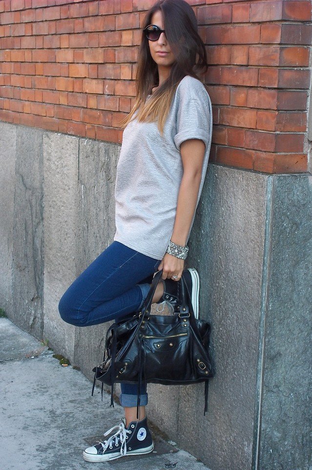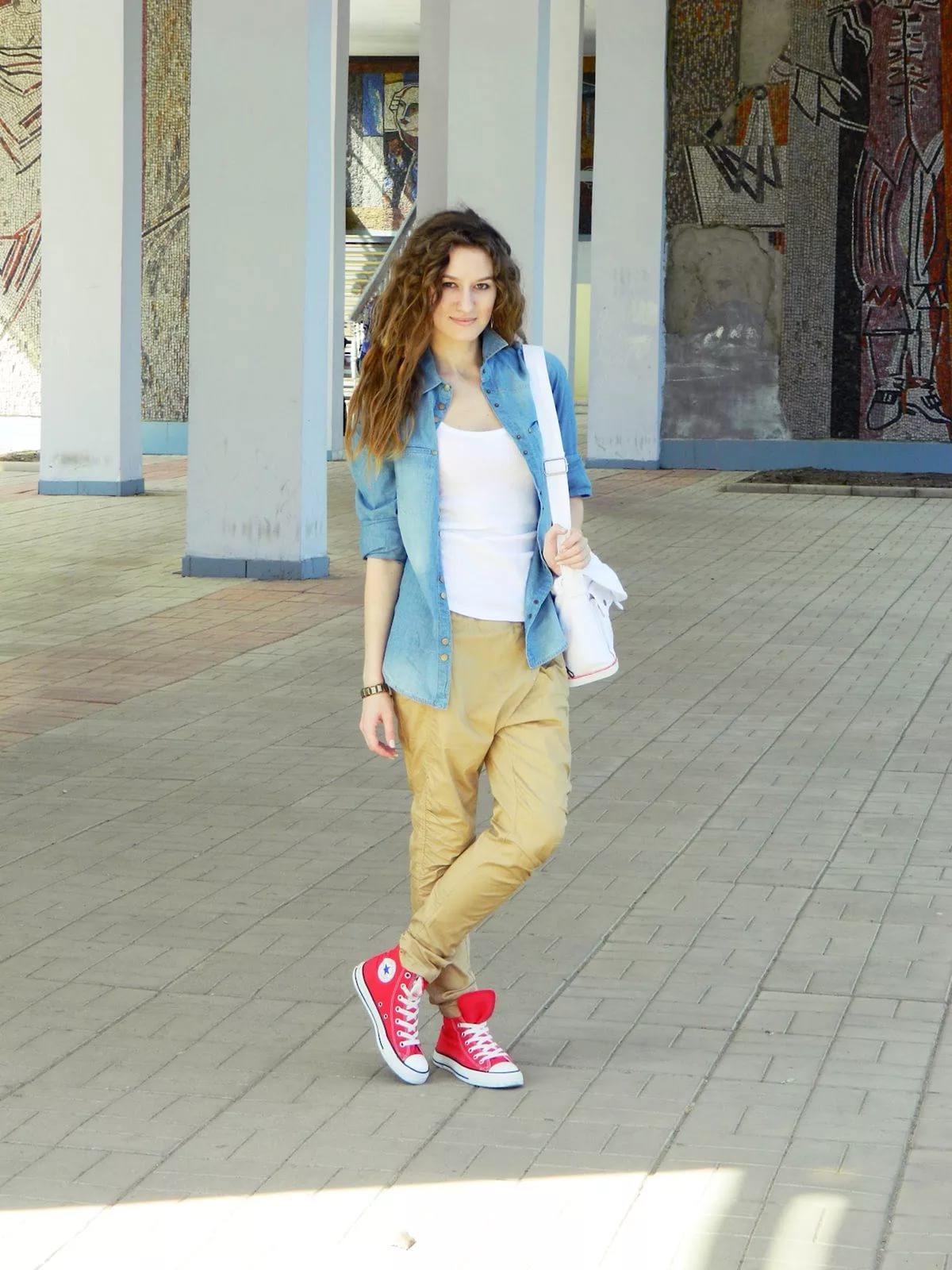 - Shopping - trousers and tunic with bright sneakers or slip-ons, denim or ombre color.