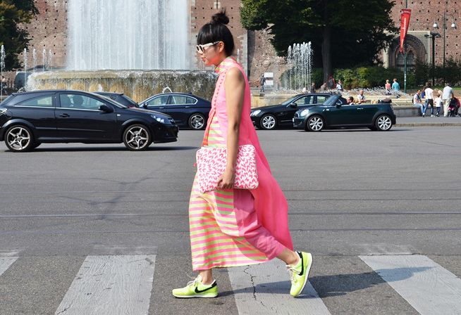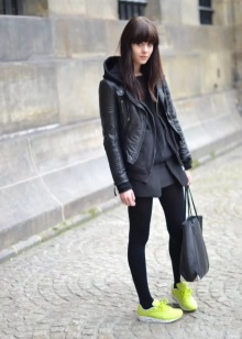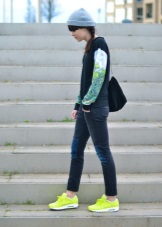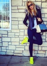 - Neon sneakers of the brightest tones are perfectly combined with white pants (without arrows). Also with such sneakers, tight pants with a white shirt will look stylish.