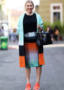- Girls can also combine bright sneakers with a medium-length knee-length pencil skirt. For clothes of top in such style the top, a shirt, a pullover, a short jacket will approach. At the same time no more than three colors are allowed in clothes. But when creating a bow with bright sneakers, it is important to remember the table of contrasts so that the image looks harmonious.