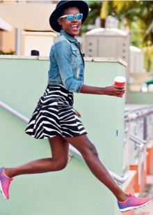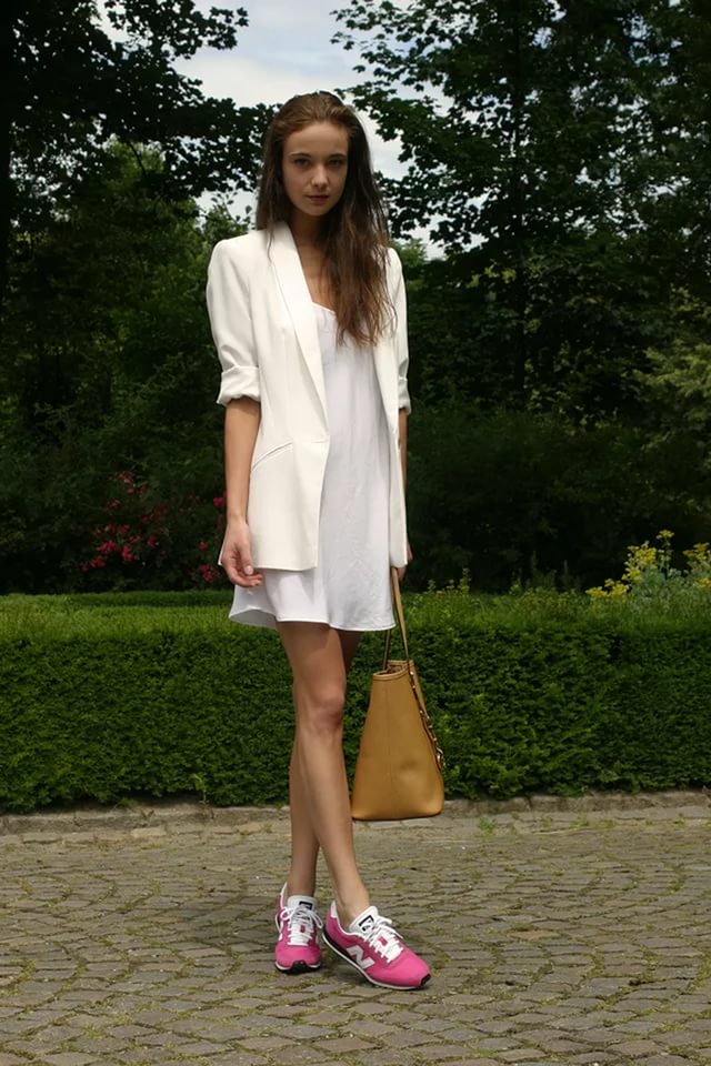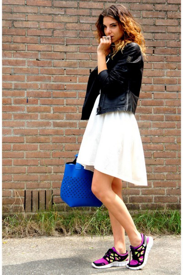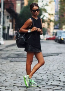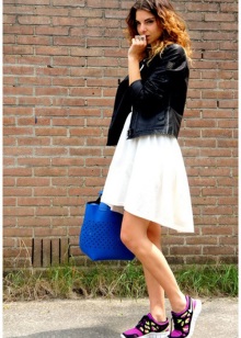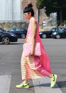 The combination of sneakers with a dress not so long ago in fashion. However, this feminine image can be applied to bright sneakers. It is worth repeating that here once again everything should be harmoniously combined.