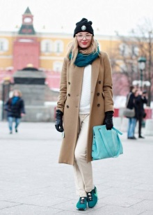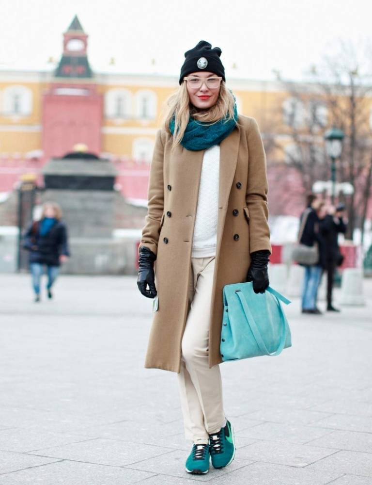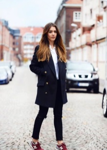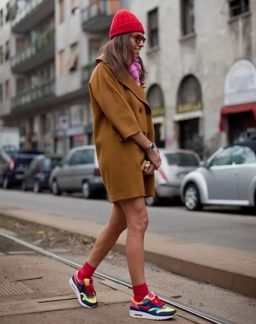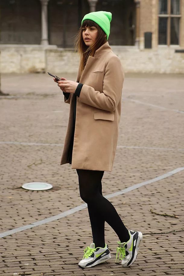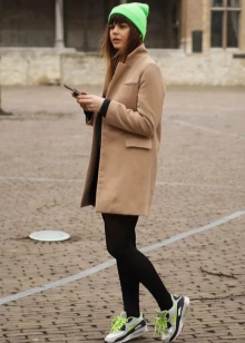 - Bright colored sneakers can be worn with a coat, vest and even a fur coat. The image with a coat is especially interesting, practical and beautiful. Excellent with bright sneakers will look voluminous coat knee-length.