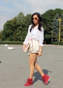 - For young girls, students and teenage schoolgirls for short skirts, pencils and shorts made of leather, suede or jeans fit colorful (bright blue, red, purple and other rich colors) models. Such bright sneakers will be the main element in the image of street style.
