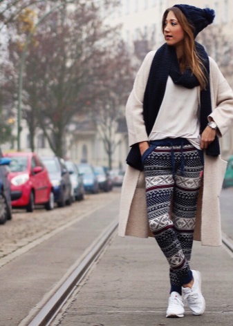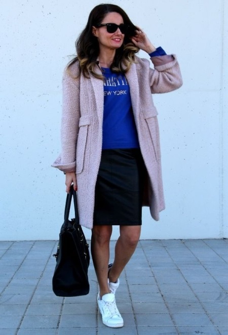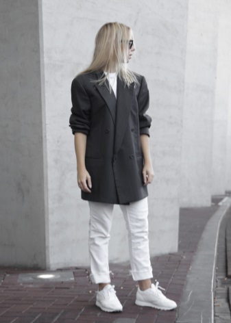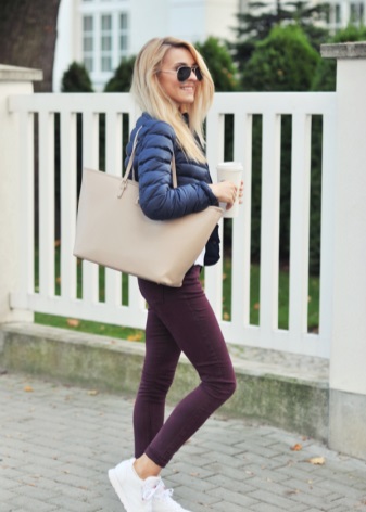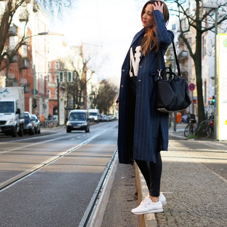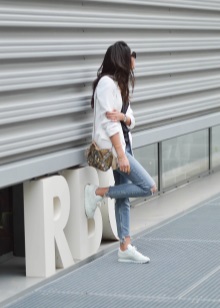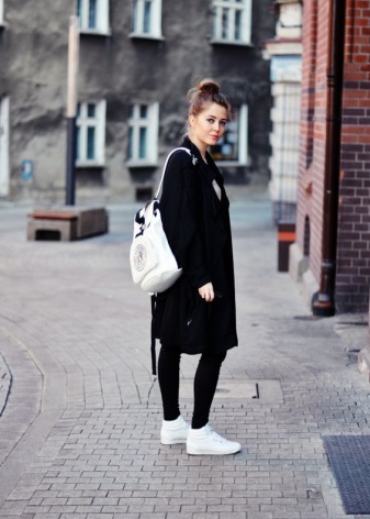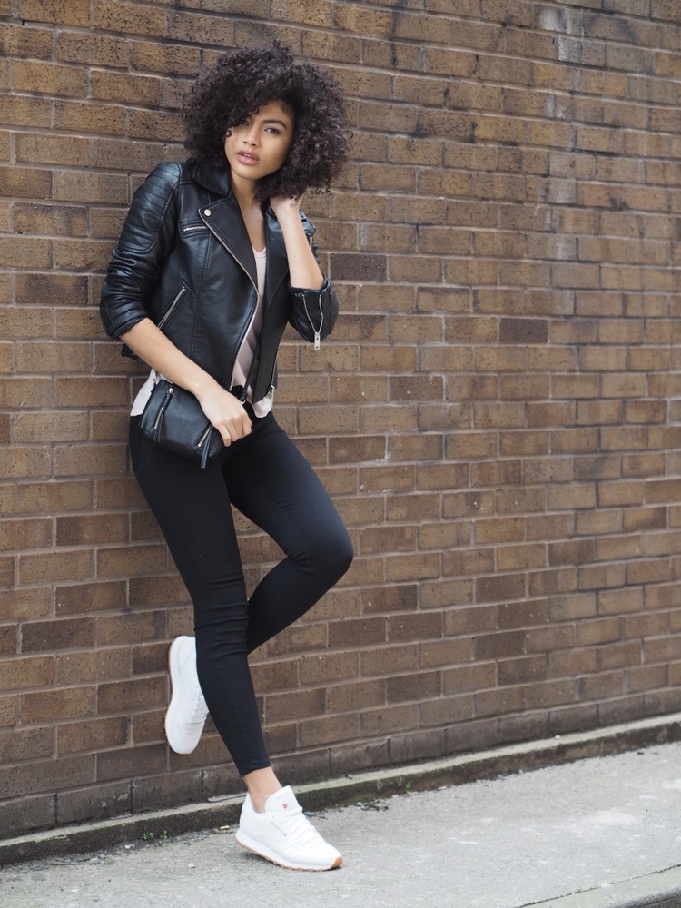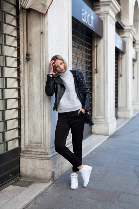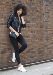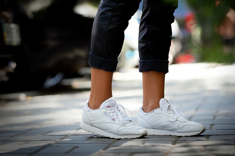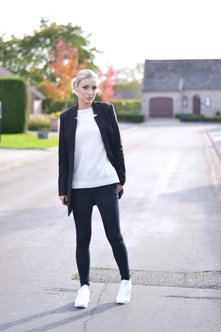 In addition to jeans, white Reebok sneakers will be perfectly combined with leather leggings of classic black color.