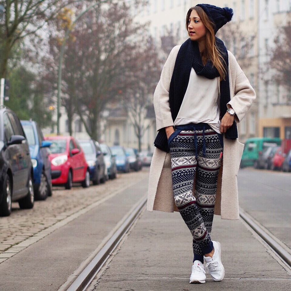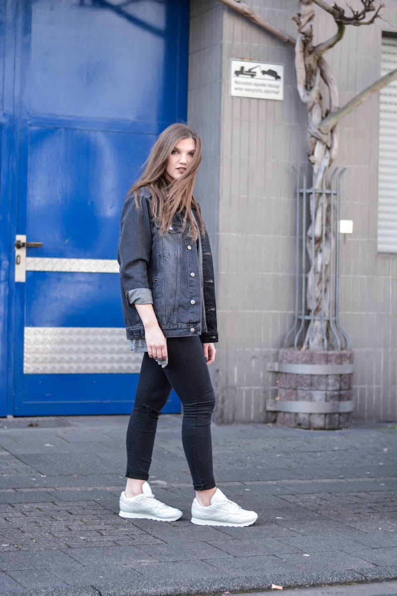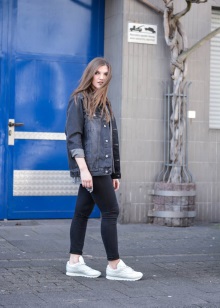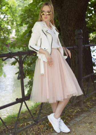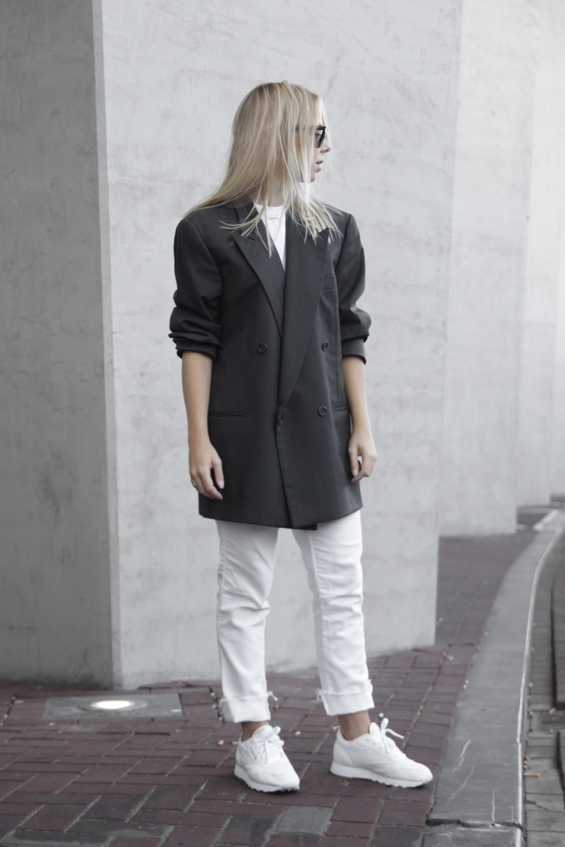 In addition to jeans, white Reebok sneakers will be perfectly combined with leather leggings of classic black color.