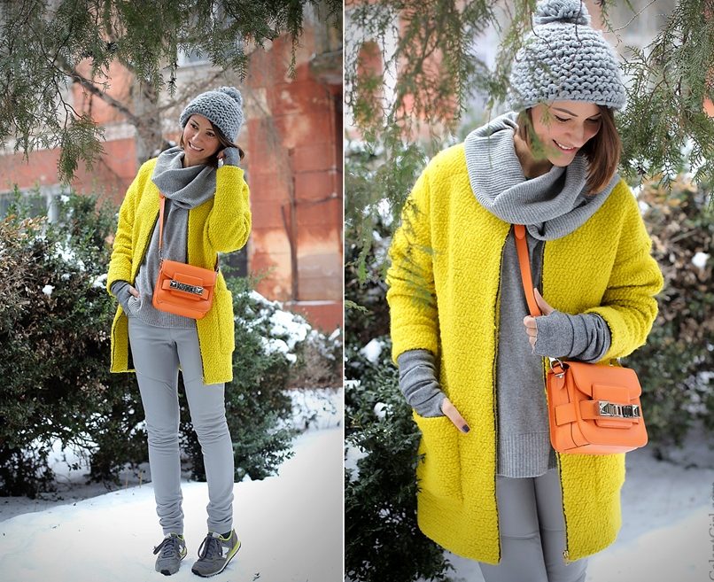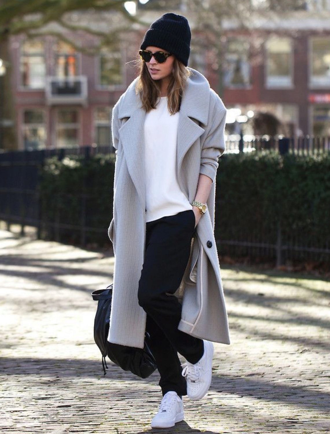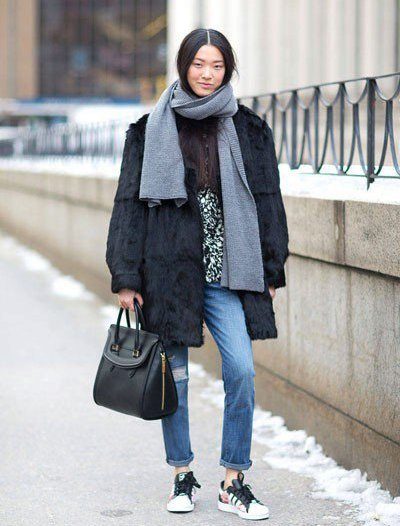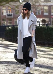 Stylish ensemble for a dynamic girl. Gray and white sneakers with an original high tongue are combined in color with a beanie cap and a sweatshirt.The shoes harmoniously look with youth ripped jeans and a straight black coat of a male cut. A volume bag fits well into the image, and a fashionable checkered scarf becomes its bright dominant.