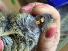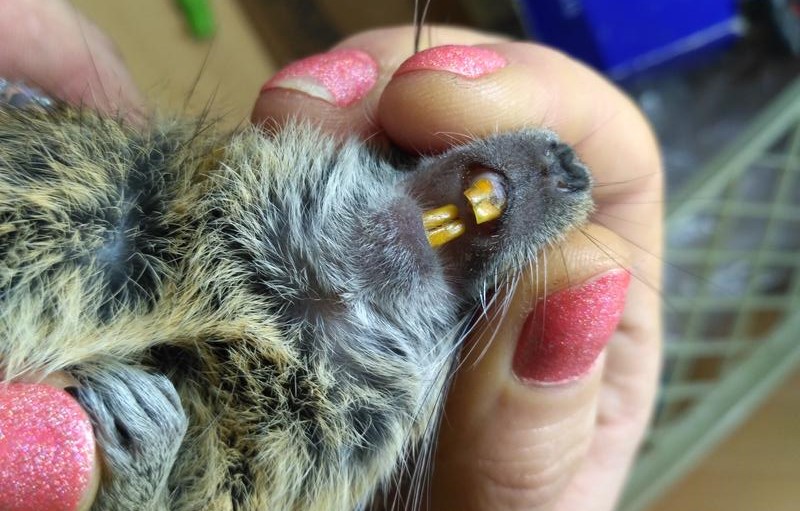 - the teeth are yellowish, a pair of upper incisors are clearly distinguishable;