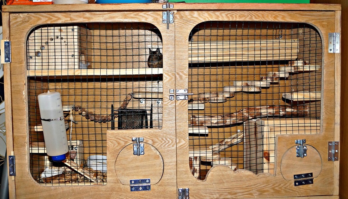 Optimally arrange two or three levels inside, as well as create a compartment in each aviary for a night sleep and rest of the animal with a hammock, usually for this they acquire a small house. In the cage must certainly be a tray with sawdustBy the way, they themselves can cover the bottom of the cell. And if the chips or sawdust are not at hand, then they can be replaced with white sheets of plain paper or pressed corn cobs.