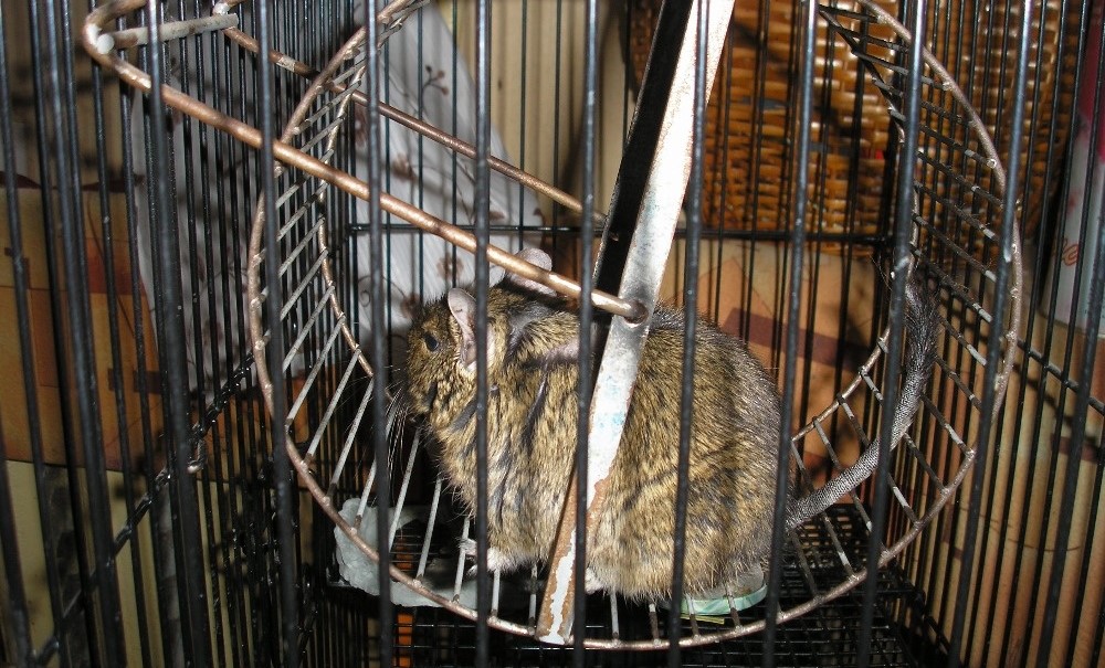 In their natural habitat, the degu are in constant motion. At home, they do not have the ability to move as intensely, because in the aviary usually put the wheel. Moving on it, the animals expend their energy and feel very comfortable. Be sure to put a few feeders for different types of food, and feeding.