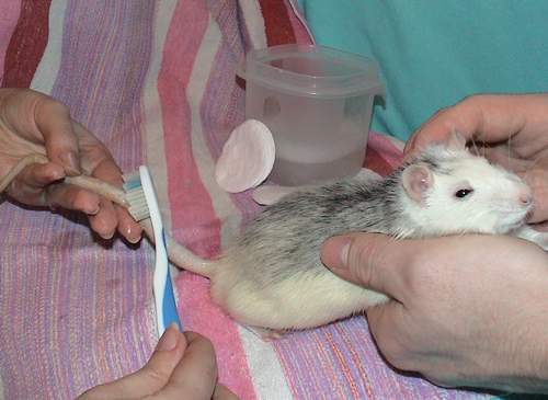 It is necessary to bathe rats in warm water. This is best done using shampoo. Sometimes a small brush can be used as a washcloth. Often before or after bathing the rat is cut off the claws.