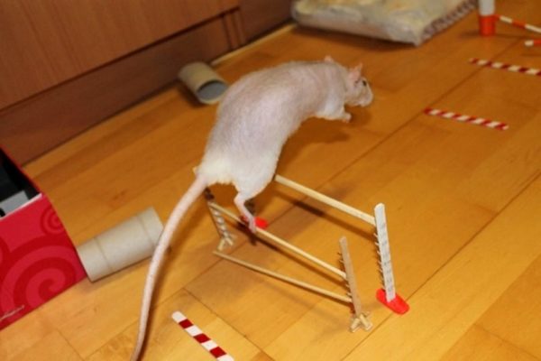The process of training rats is simplified due to their friendliness. Individuals can be easily tamed to climb in the host's long sleeves and crawl out. Rats love to swarm in boxes and find something there. By regularly encouraging and stroking them, rats can be taught to bring some small thing or jump over obstacles.. Rodents can also easily learn to climb a rope or a hoop.