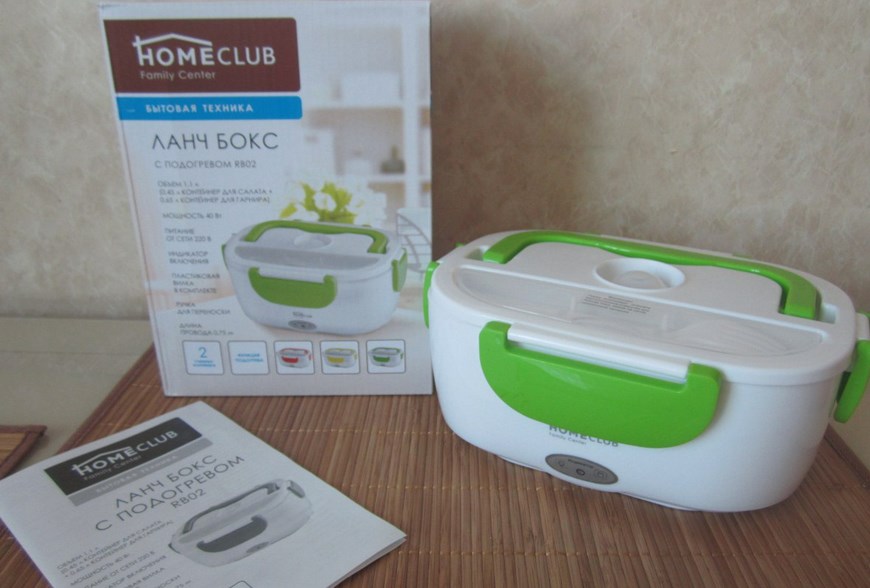 Receives positive reviews and the product Electric Lunch Box. The container is made of high-quality food-grade plastic and is equipped with a convenient carrying handle. There is a separate compartment for cutlery. The set includes only a spoon.