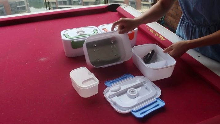 The container has two compartments, one of which is removable. Separately worth mentioning is that removable bowl has a sealed lid, which is very convenient. Heats food lunch box for 30-40 minutes.