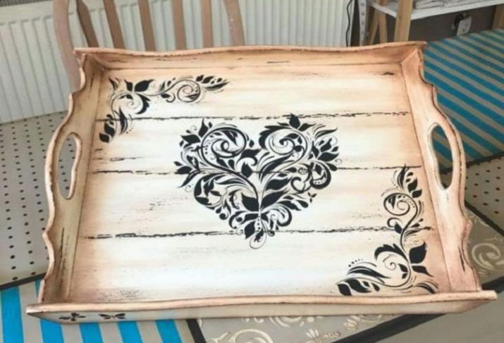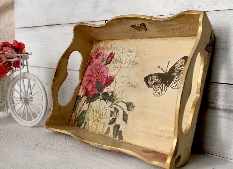 The surface must be cleaned of varnish and oil-wax coatings. Go through the sandpaper and paint-base of any favorite shade. Applique pattern neatly cut from napkins or wrappers. Apply glue to the wrong side, attach it to the bottom of the tray and wipe with a damp cloth until smooth. After drying, cover the surface with 2-3 layers of acrylic lacquer. The made accessory will be ideally combined with the interior, if you paste the same applications on other surfaces of kitchen furniture or dishes.