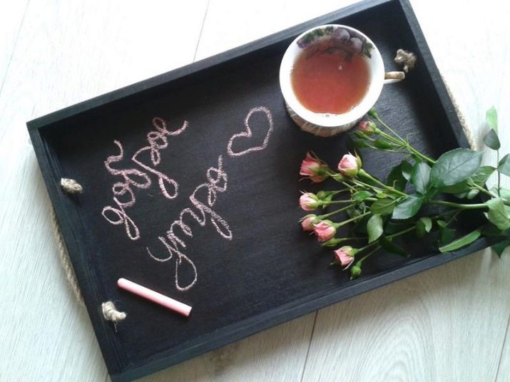 Magnetic slate paint will give the bottom a roughness. Dishes on such a surface will slip less, and the design itself will become an unusual decoration of the house. The main feature of the tray is that you can leave notes and inscriptions in it, attach magnets, draw with chalk. To create a tray will need: masking tape and brush. The sides need to be pasted over with adhesive tape, and from the surface to remove the protective layer and degrease with alcohol. After applying 3-5 layers of paint and leave for a day. After drying, you do not need to cover anything. Hard matte surface will last a very long time.