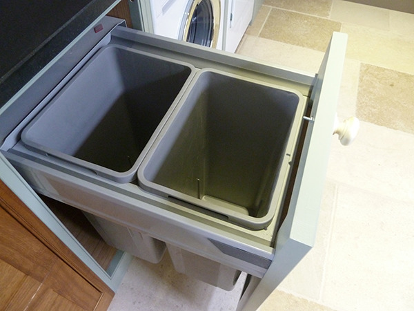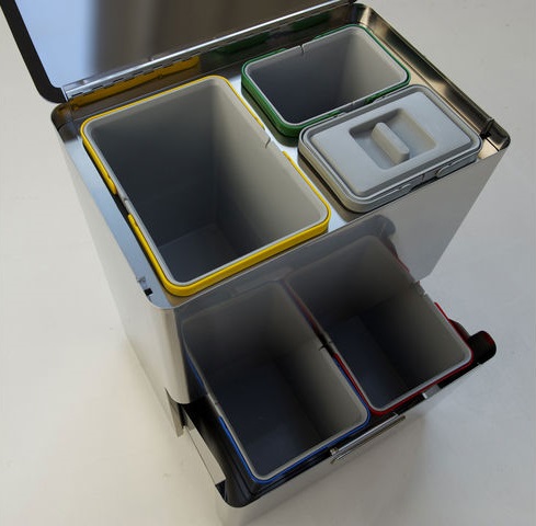 You can make a small wall of the lockers for garbage without even having shelving. This was taken care of by an Italian company. Their products are called Drop-Front Recycle Bin.If you compare with the usual things, then the lid of such boxes is very similar to the lid of the chute in a high-rise building. That is why you can also build a whole wall out of them and place them in any order.