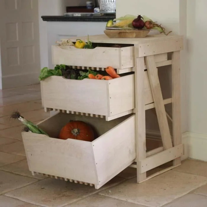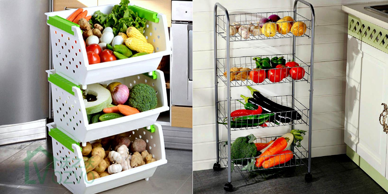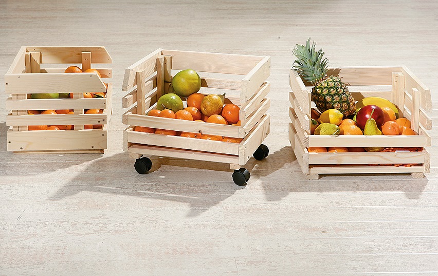 - Rack or shelf. Stationary or on wheels storage systems consisting of 6 compartments in which you can keep both fruits and vegetables. Mobile version is ideal for a small kitchen. In the large kitchen, you can install a mobile or stationary wooden shelf.