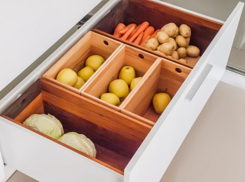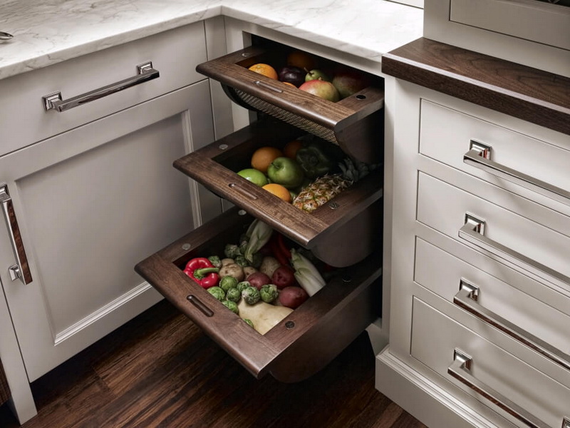 - Retractable storage systems. In kitchen sets, there are often special metal pull-out systems, as well as wicker or plastic baskets, which are advanced. If there are no such systems in your headset, then you can store vegetables and fruits in plastic, metal, wooden, wicker containers installed in the pull-out kitchen drawers.