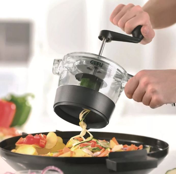 Somewhat different in form and principle of operation from previous species. spiral vegetable cutter. The shape of the device resembles an hourglass, and the principle of action is a pencil sharpener. In order to chop vegetables with it, you need to insert the product, and holding it with one hand, turn. It is inexpensive and quite easy to operate and maintain.