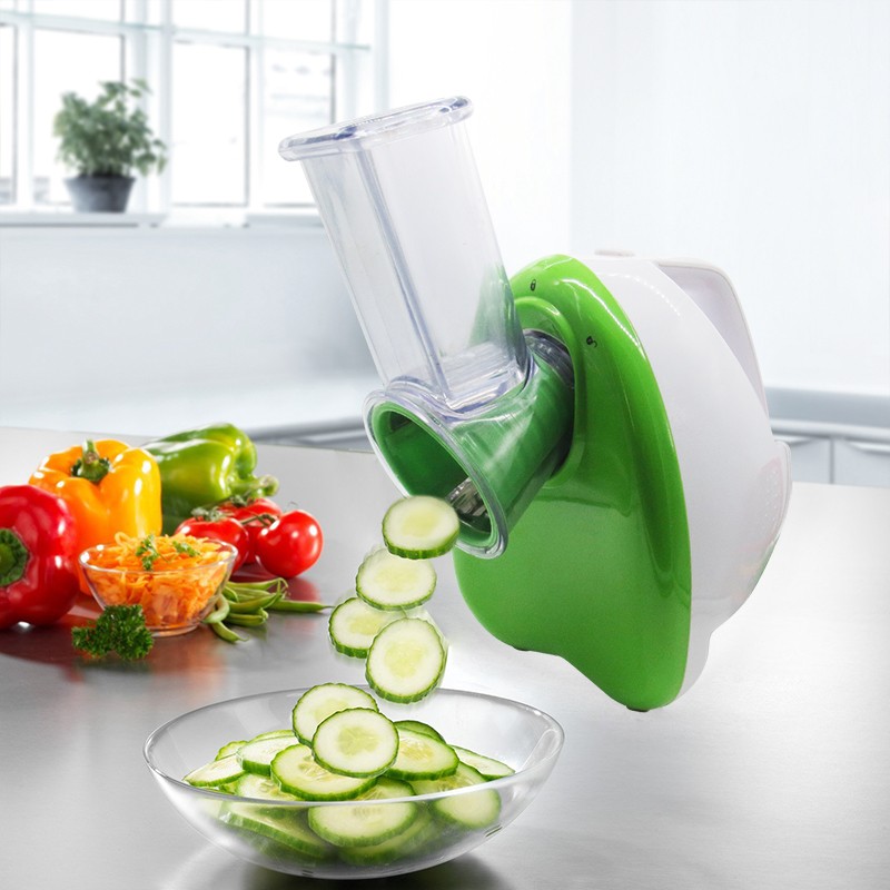 - Auto Models vegetable cutters are more productive in comparison with classical options. In addition to various nozzles that allow you to cut vegetables of different shapes, most models have a function that allows you to grind meat. In addition, some models have a nozzle that allows shred the cabbage in thin and narrow slices. Such devices are compact, durable and have high performance. Their cost is somewhat higher than that of classic vegetable cutters, but they also perform more functions.