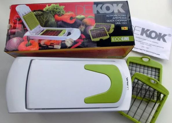 Slightly smaller vegetable cutter 5 in 1 Nicer Dicer Quik. Although it differs from the previous model in a very compact size, but this little one is no less functional. Cubes, straws and slices can be obtained with one click, and from the container receiver they can be immediately moved to a salad bowl or frying pan.