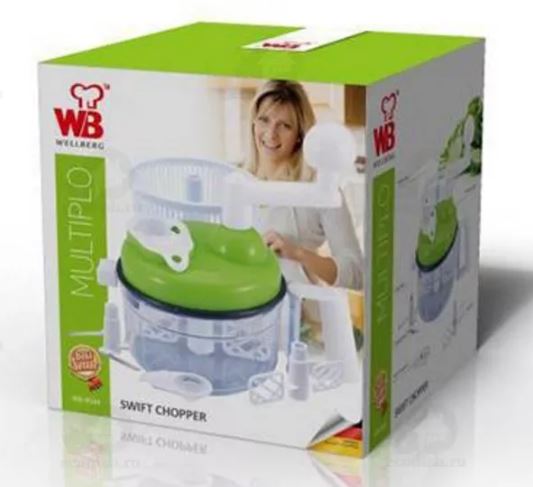 By the principle of rotation, the vegetable cutter-chopper works Wellberg 9549 WB. With its help, you can not only chop vegetables, but also dry lettuce leaves (an additional container is included in the kit), separate the white from the yolk (the separator is located on the lid) and beat the white with a special nozzle. It is convenient to use such a grinder, the feet of the platform on which the container stands are rubberized and fix it well on the surface. The container itself is easily removed with one click on the button.