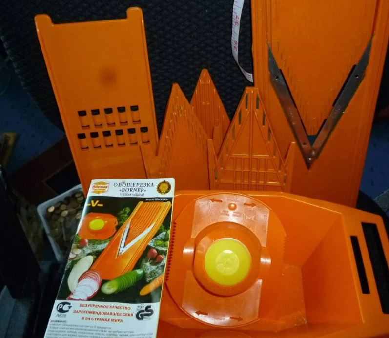 German vegetable cutter Borner Classic sold in stores at an average price. Consists of a V-shaped frame, fruit holder and various inserts for cutting. It is functional, durable, easy to maintain and easy to use.