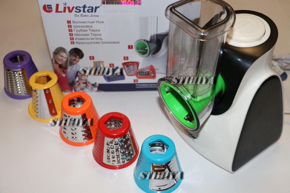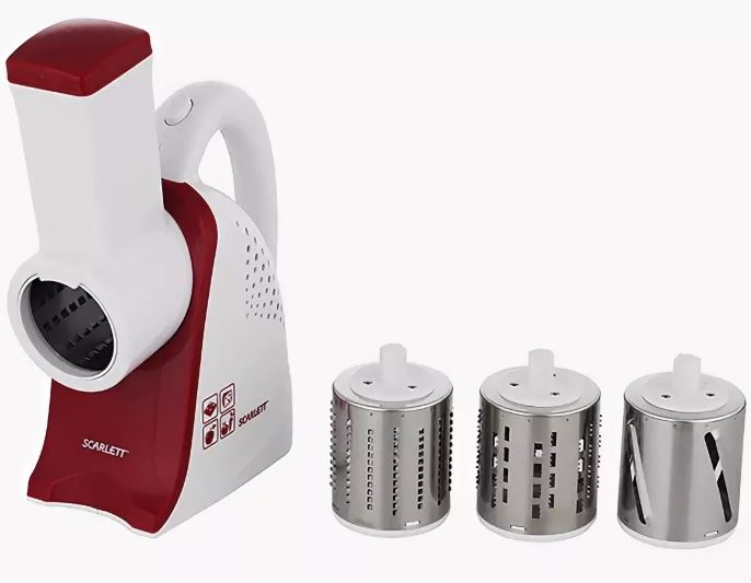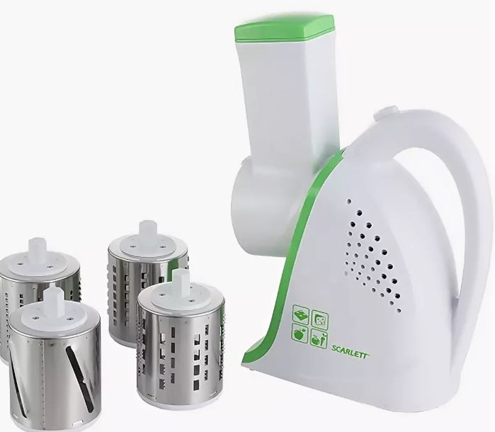 Review electric vegetable cutters should start with the most inexpensive model Scarlet SC-KP45S01. It is compact, reliable, stable and has a low power (200V). Two types of nozzles in the kit allow you to quickly cope with cutting vegetables, and one is specifically designed for chocolate rubbing. Negative points of use include the difficulty of washing nozzles.