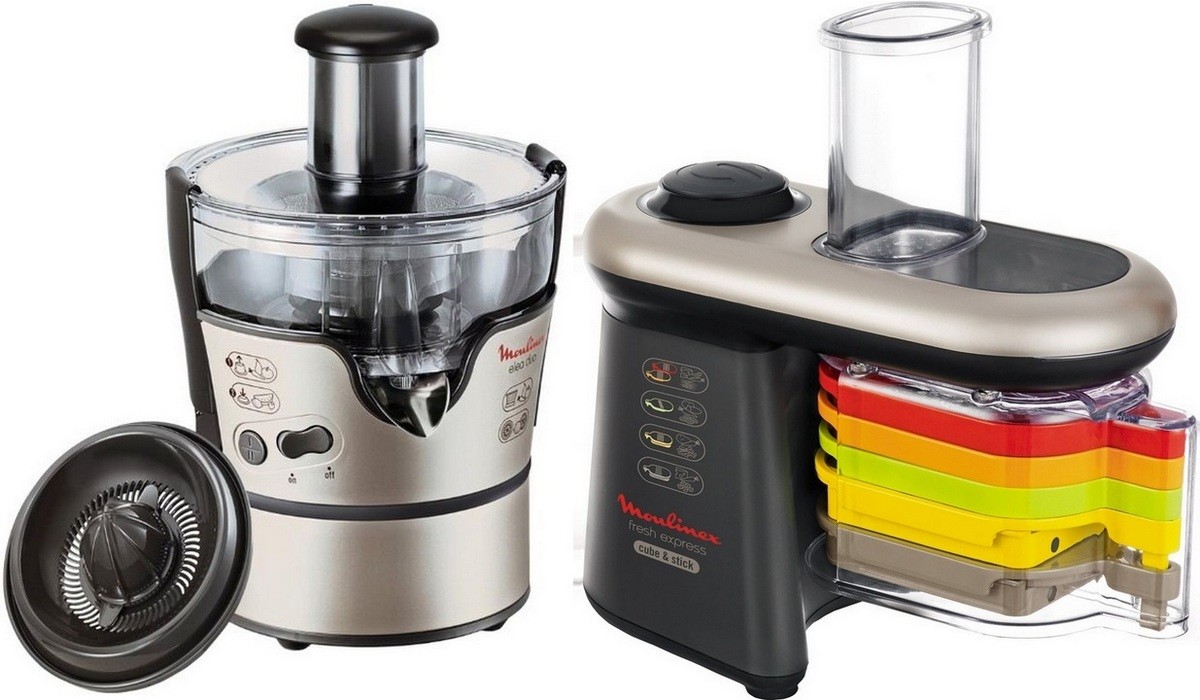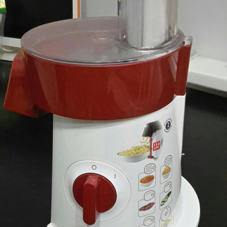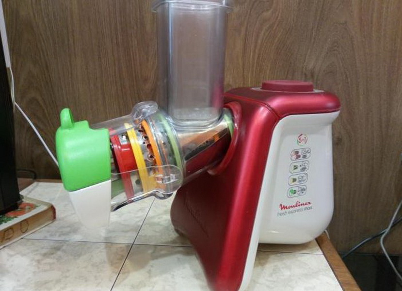 More advanced models from the same manufacturer Moulinex DJ 9008 and Moulinex Fresh Express Cube. Creative design, thoughtful management, high power and high-quality material for the manufacture of housing and nozzles. Nozzles, and their 5 pcs. in the set, they differ from each other not only in the shape of the holes, but also in color. For their placement does not require a separate place, they are all perfectly stored in a special compartment, fixed in the vegetable cutter itself.