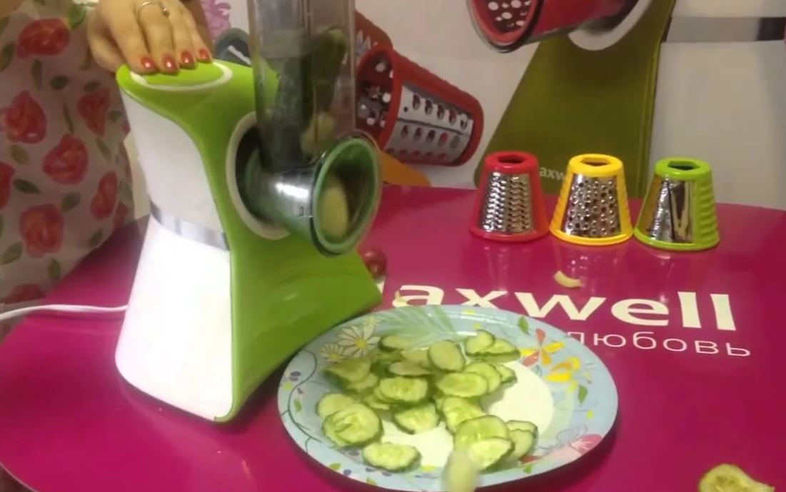 Multi-cutter Maxwell MW-1303 G although it works in one mode, but it copes with cutting products quite quickly. The kit includes 6 nozzles with which you can chop, chop and grate any vegetables into slices of different thickness and size. It is incredibly convenient to use it, the upper chamber for receiving food is quite voluminous, so there is no need to chop vegetables before loading, there is no need to select a container for receiving sliced food, any shape will do.