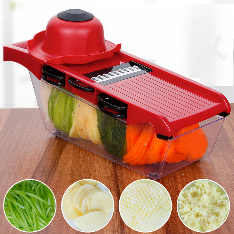 Not the last place in the ranking is taken by such a model as the universal Multi-Function Vegetable Slicer Grinder. This multislayser is a compact device with a replaceable set of nozzles, with which you can shape not only vegetables, fruits, but also sausages, cheeses. Blades in the nozzles are made of stainless steel, so they will last a long time.