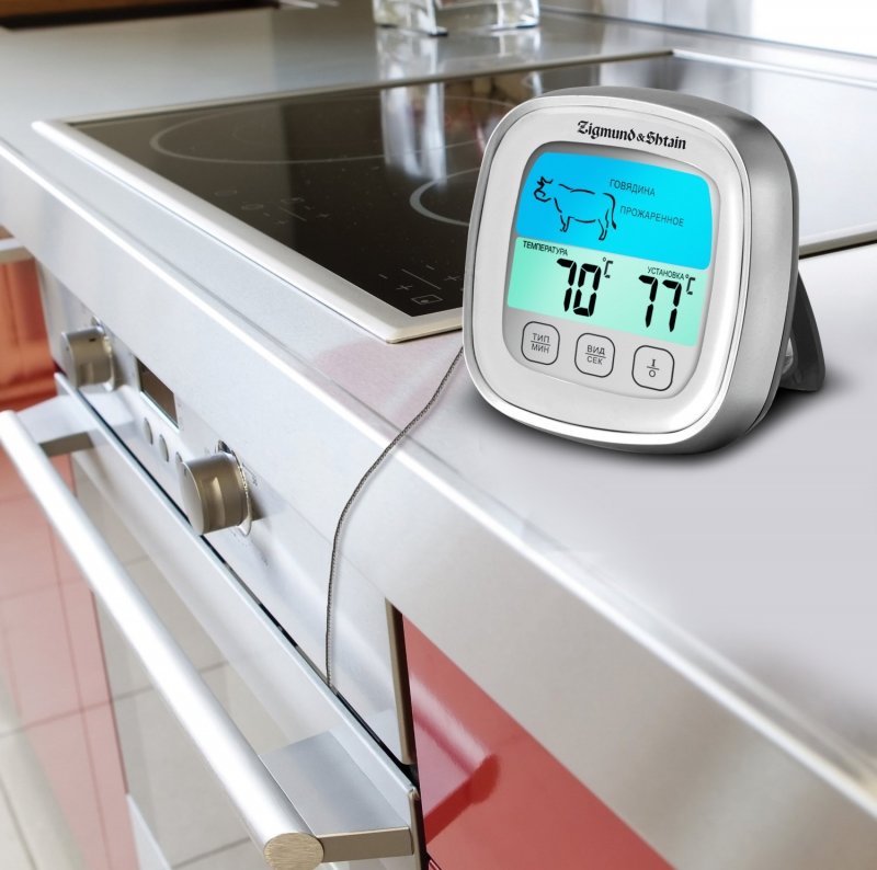 - not every thermometer is suitable for preparing a particular dish (a simple thermometer will not show the temperature inside a piece of meat, and a probe will not be needed if the dish is baked quickly and evenly);