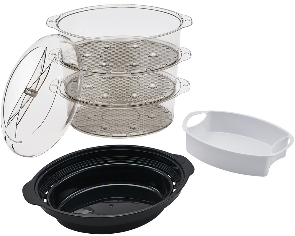 - After boiling water gradually forms a dense stream of steam, which is evenly distributed in all bowls, while thermally processes the food.