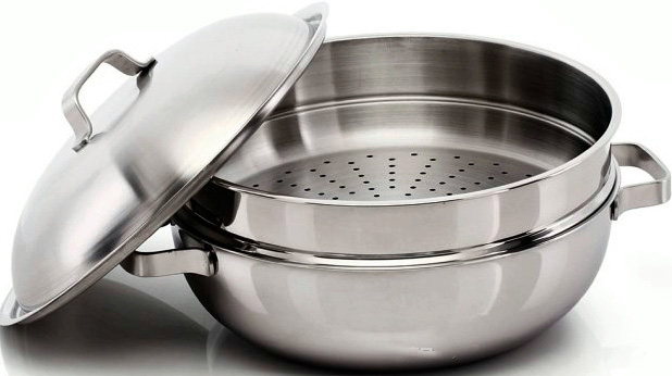 Metal double boilers are most often models made of stainless steel. The advantage of steel steamers is that they heat quickly, serve for a long time and do not saturate food with harmful elements. By design, this double boiler is a double bottom panwhere water is poured on the bottom bottom to generate steam, and food is placed on the top thin bottom to heat or process food.