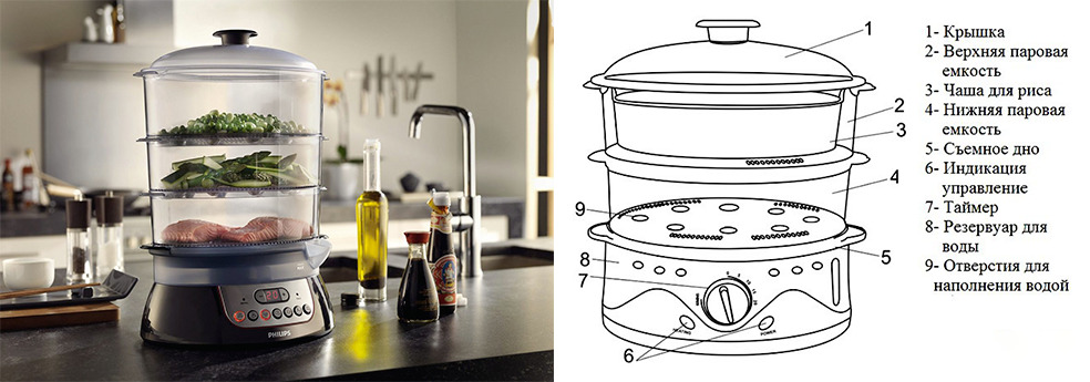 In short, the steam cooker processes food due to the strong steam flow that is formed by heating water in one of the containers of the appliance. The device works as follows.
