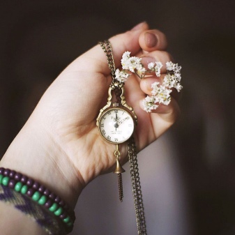 Pendant watches are made mechanical. Complemented by a chain of original weaving, they are perfectly located on the female neck. More modern models are electronic. They are increasingly replacing mechanical watch. Although they also do not lose their attractiveness, becoming a rarity.