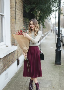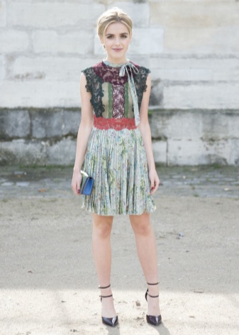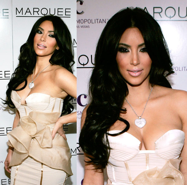 If you plan to go out and want to outshine everyone in a luxurious way, take an example from Kim Kardashian. Designer dress bustier milky color with a deep neckline. It is decorated with chiffon drapery at the waist in the color of cappuccino. From jewelry - only a pendant in the form of a huge heart, studded with a scattering of small stones.