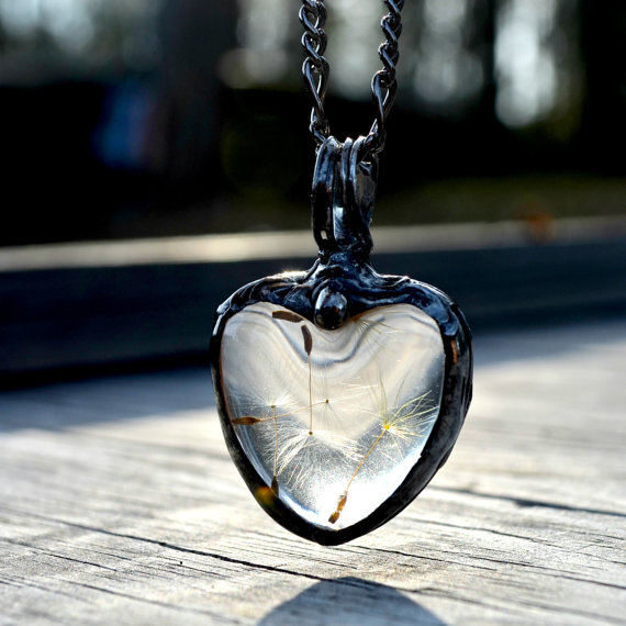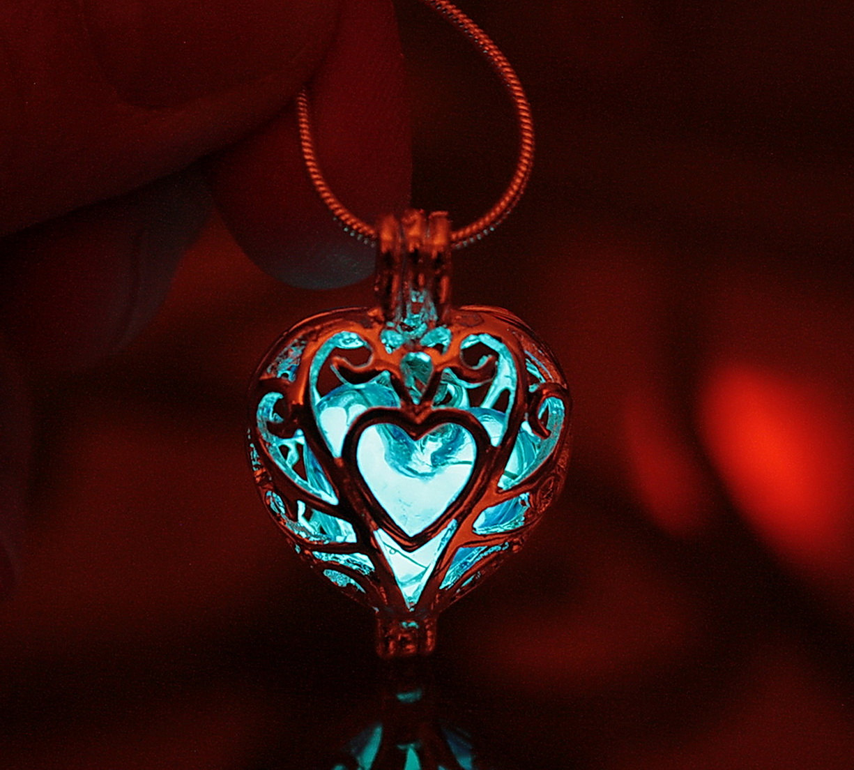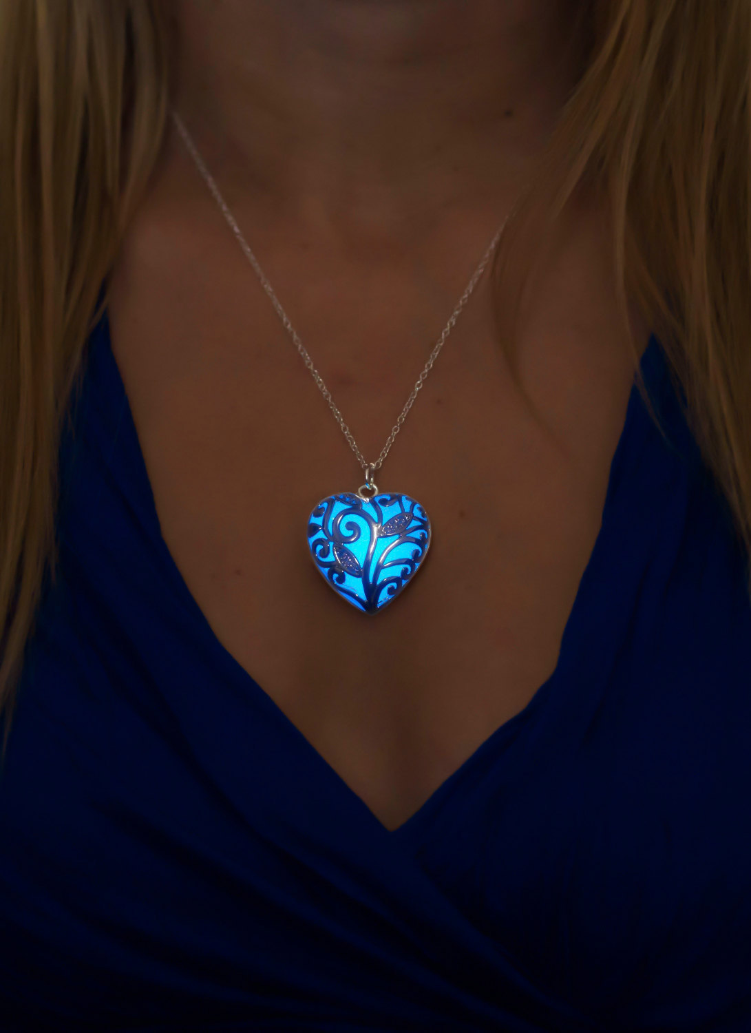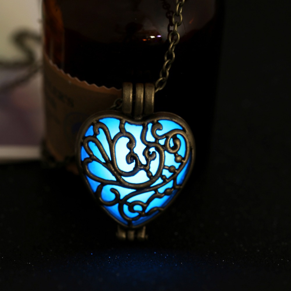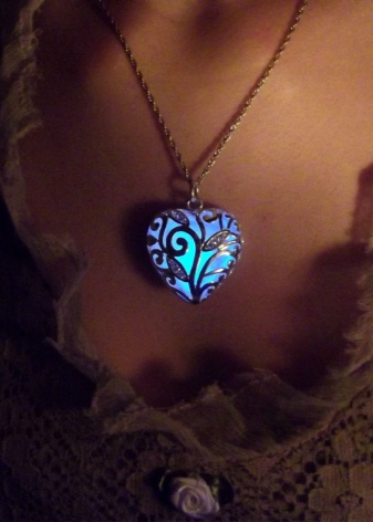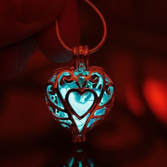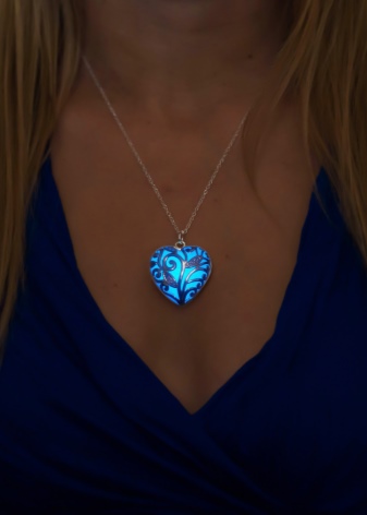 Unusual decoration, popular among young girls. In a pendant in the form of a heart, a stone with a luminescent pigment is placed, which glows in the dark. For this, it is necessary that he meet with sunlight more often. It is not difficult, because during the day it looks like an ordinary piece of jewelry.