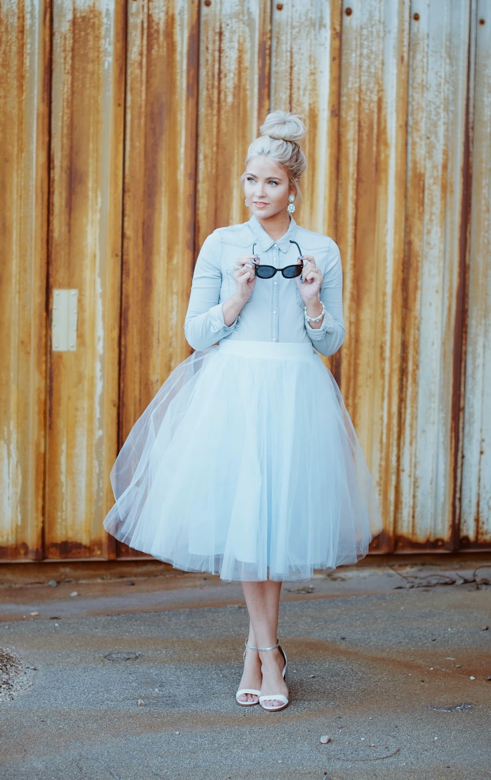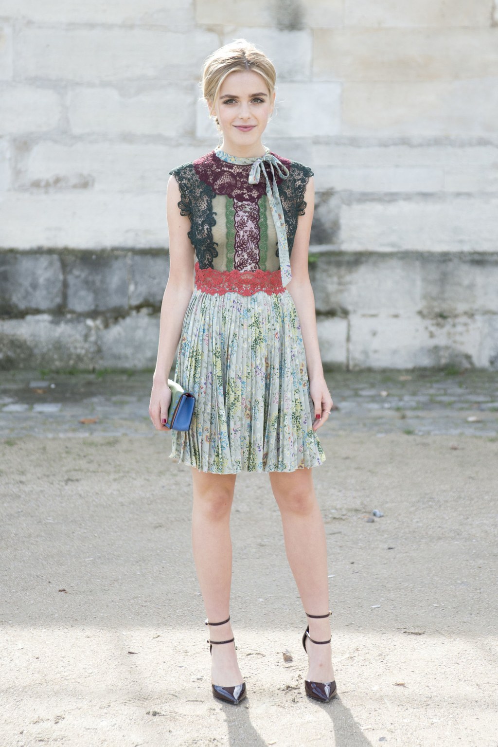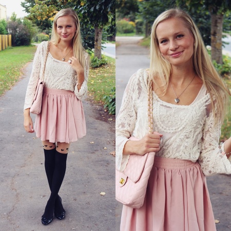 Great look for a date. Romantic dress with floral print, which is spectacular and modest at the same time. Black shoes with a heel, a small tonal clutch and a silver heart-shaped pendant. Very cute!