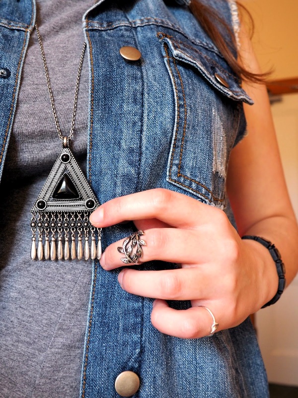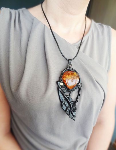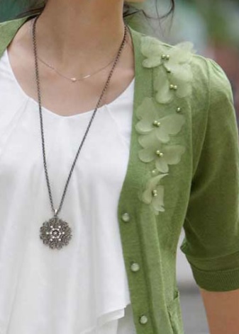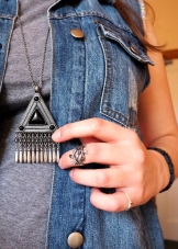 Miniature pendants will look great in business looks. Most often they are worn in the neckline of a blouse or sweater, but it is worth noting that this should be a very small neckline. Large pendants on a cord or chain can be worn over clothing. They will decorate a plain sweater or turtleneck, reviving and diversifying a boring look. A volume decoration, for example, a geometric shape or in ethno style, with inserts of semi-precious stones or wooden elements will suit a rough-knit sweater.