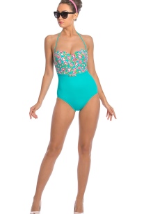 One-piece or split turquoise swimsuit with a top under the throat is a great option for ladies with narrow sloping shoulders, a sporty figure and a slim waist. It creates an emphasis on a pretty face and eyes, seductive forms appear on the bust.