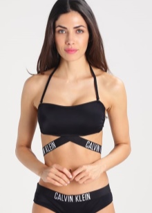 Brand products are complemented by large branded logos. This addition is used not only in the creation of swimwear, but also in the manufacture of underwear. There are very original products in which a wide band with a contrasting brand name is located on the straps that intersect with each other.