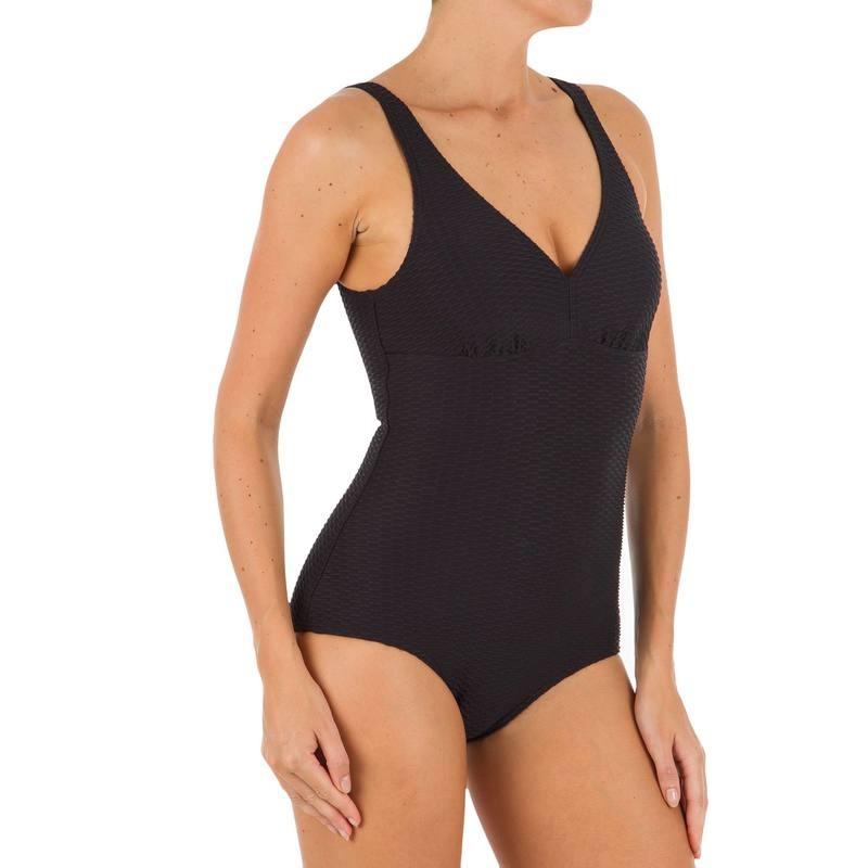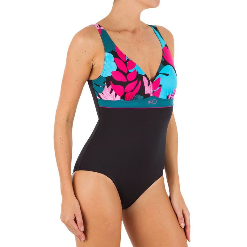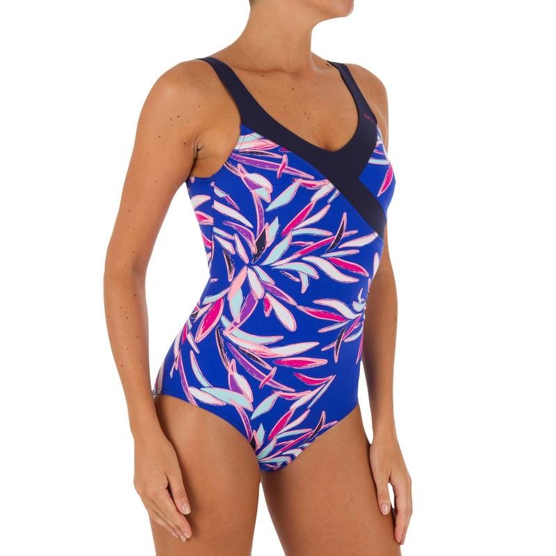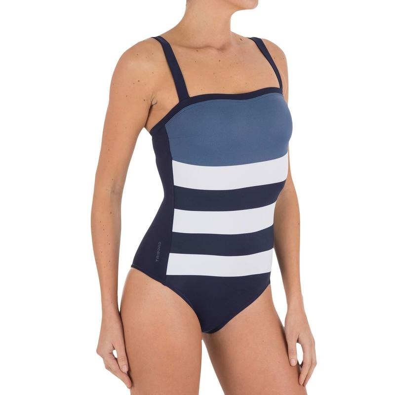 Concise women's swimsuits with wide straps look very nice. Similar products from Decathlon fit the lady with any chest size and build. Closed product will hide many figure flaws.