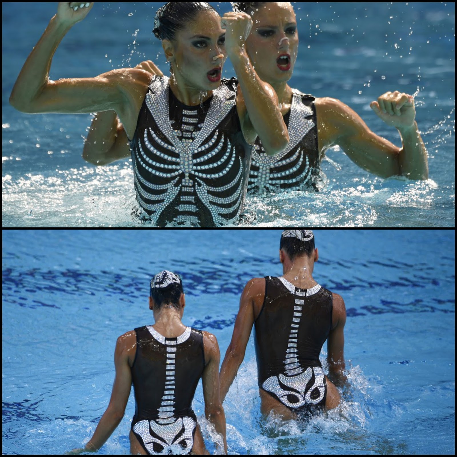 Swimsuit should be not only beautiful, but memorable. Spectacular outfits, resembling biker clothes rather than swimsuits for swimming, are made in a bright combination of red and black colors. As a decor, large rhinestones imitating metal rivets are used. Caps are chosen in exact accordance with the stylistics of costumes.
