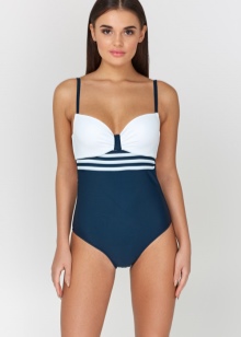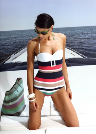 Some models are very frank. They are two vertical wide stripes connected below the waist. This swimsuit is fixed with a strap around the neck, straps at the back and straps on swimming trunks. Thin lines give the figure elegance.