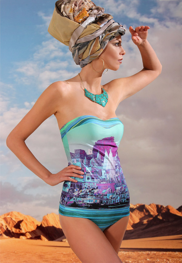 Another well-known brand, whose products are distinguished by bold experiments with colors and shades. They are also recognizable by inserts of contrasting colors and floral patterns. Some models are equipped with thin capes and pareos.